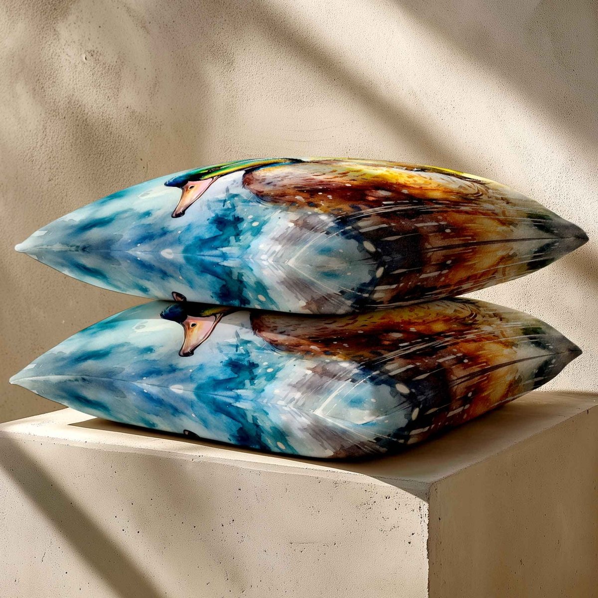 The Mallard on Wilfin Beck square cushion captures a vividly detailed mallard gliding on water, giving any space a serene focal point. The velvet texture adds depth and softness to the rich imagery.