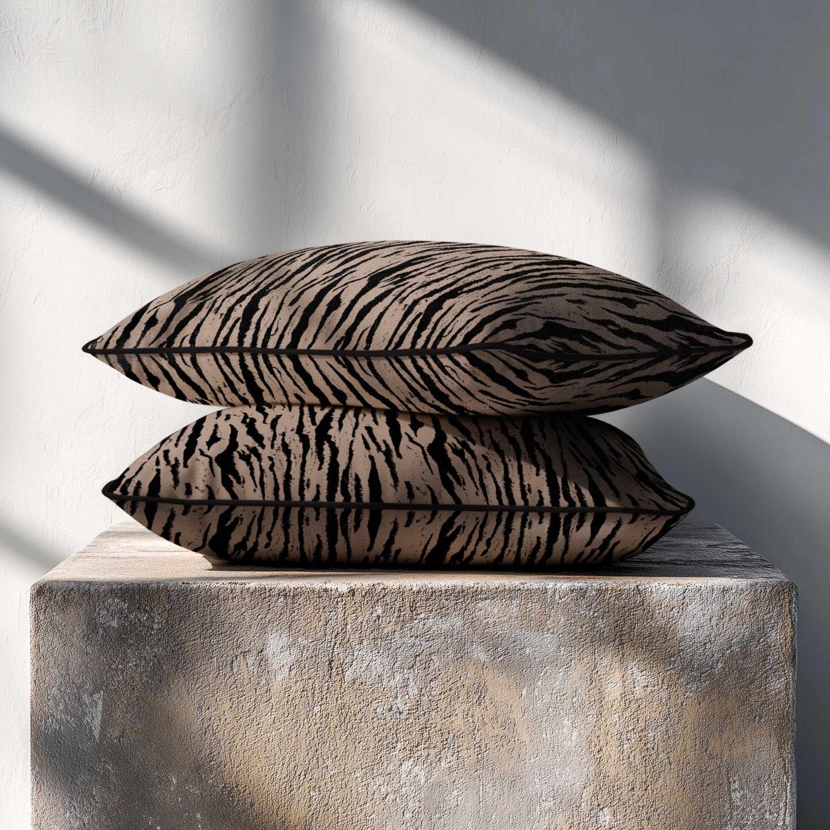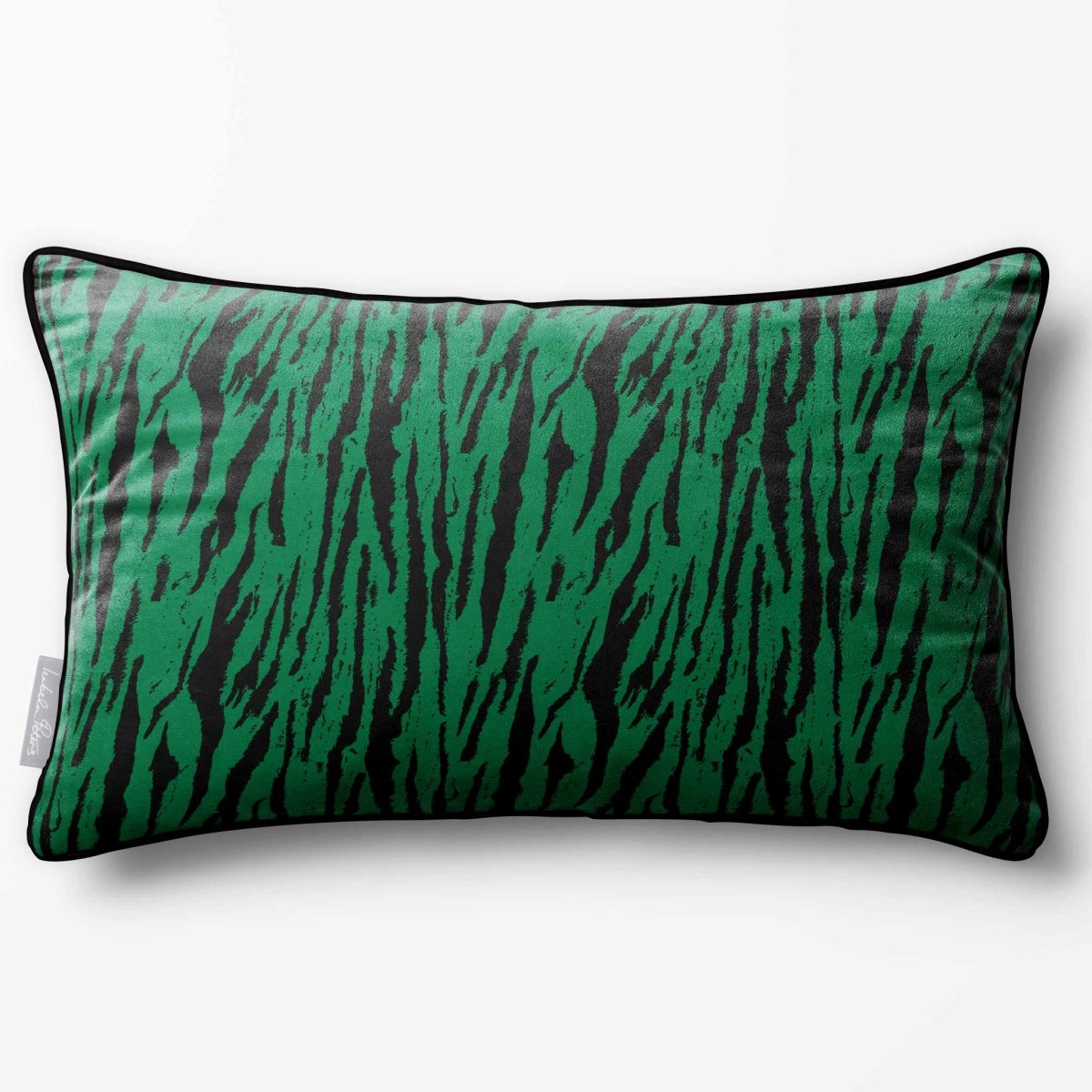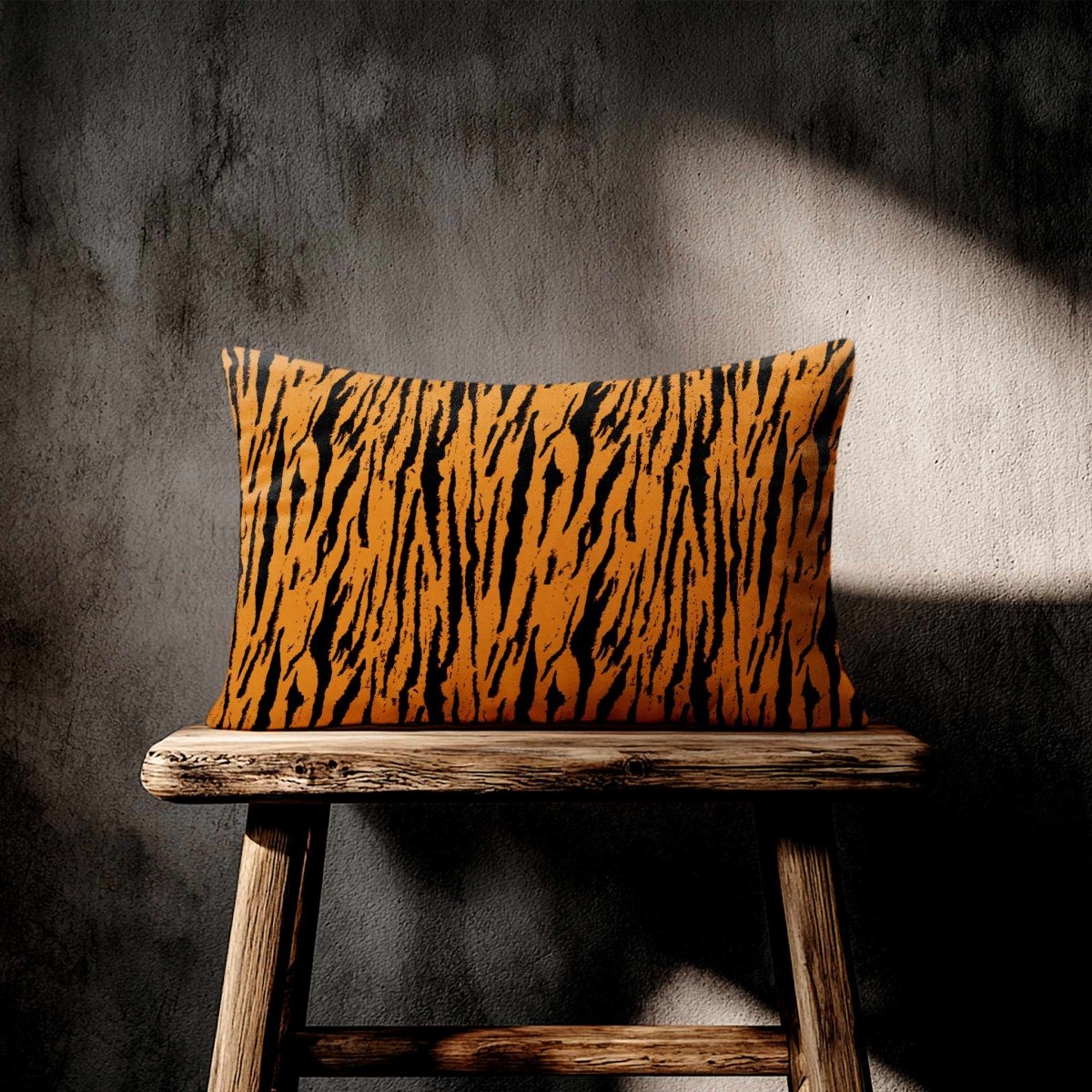 The Tiger Print rectangle cushion displays its bold stripe motif across a wide frame, making a confident statement in any room. The velvet finish adds softness and depth, balancing the strong design.