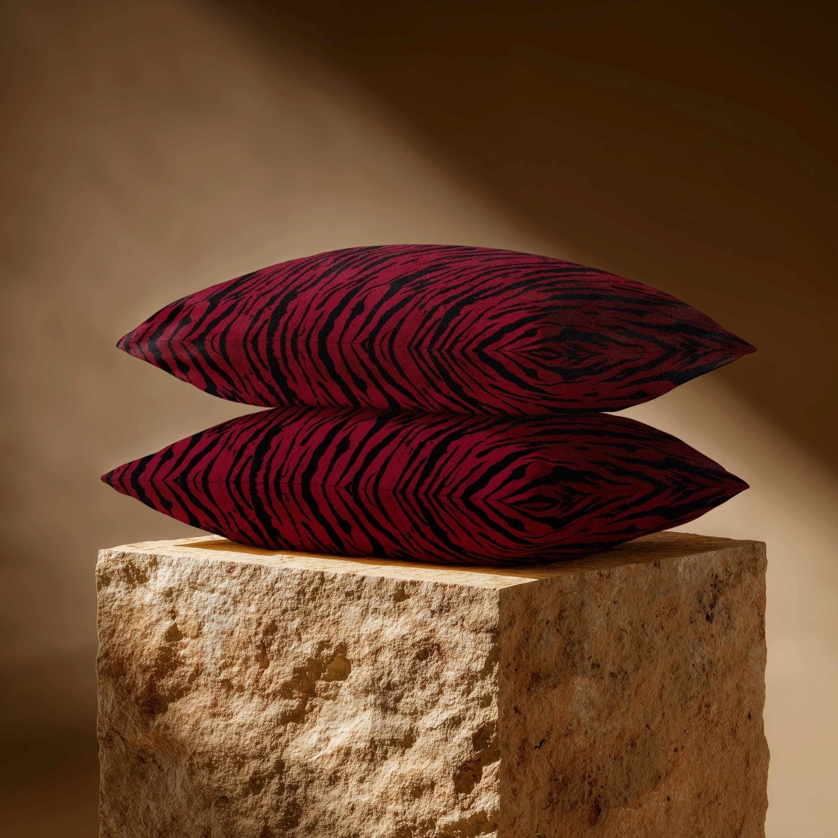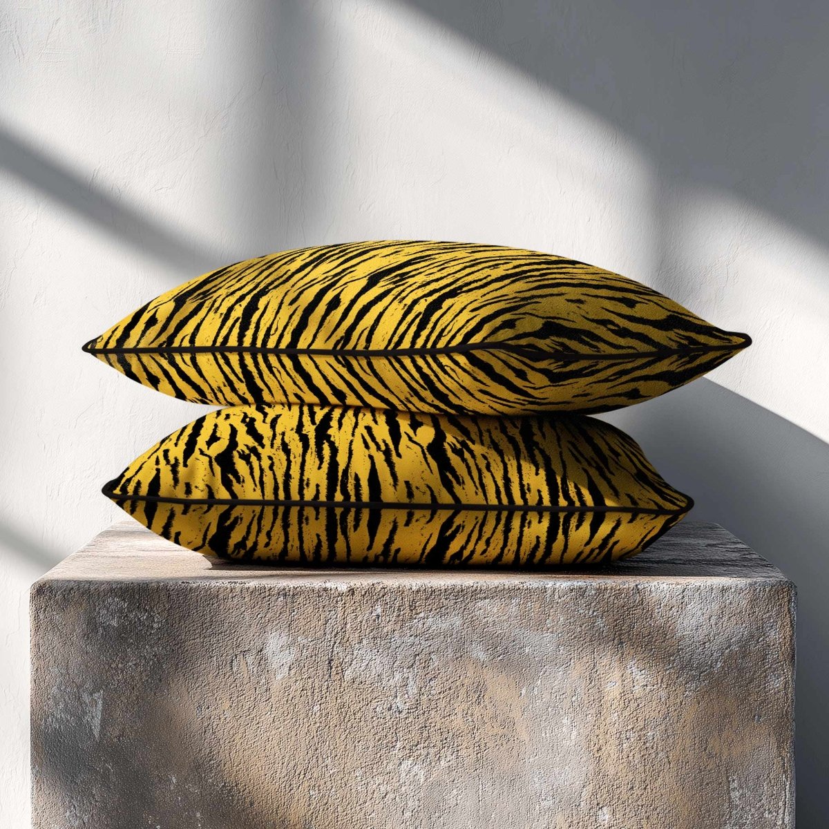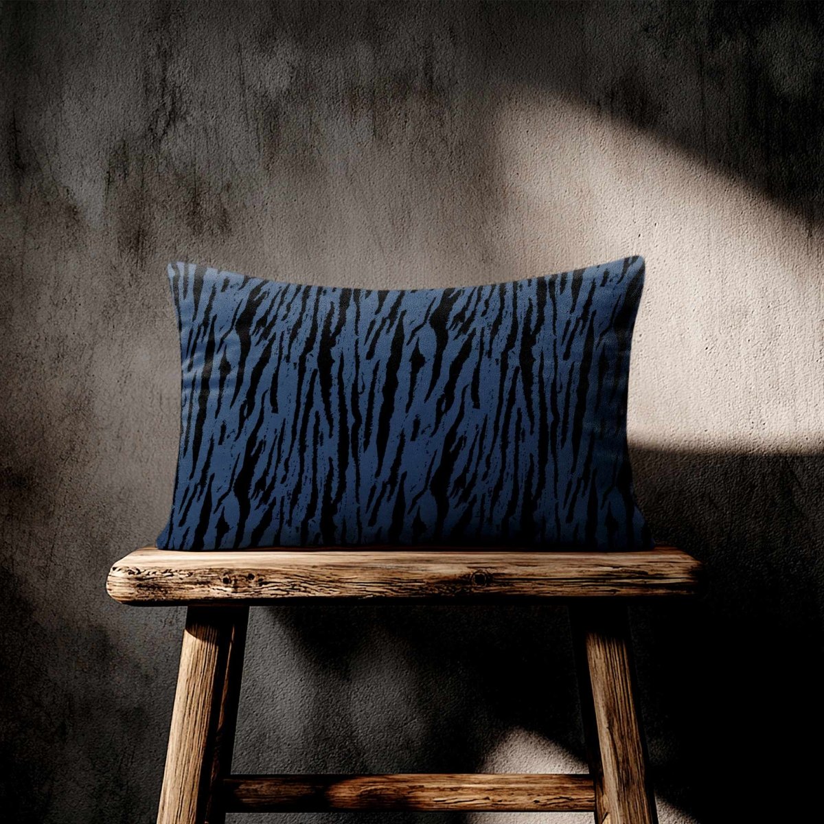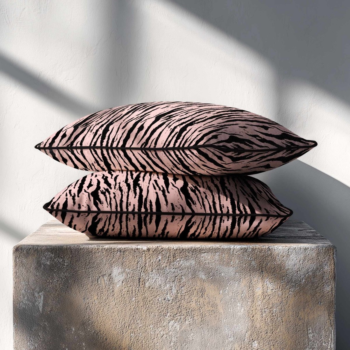 The Tiger Print rectangle cushion displays its bold stripe motif across a wide frame, making a confident statement in any room. The velvet finish adds softness and depth, balancing the strong design.
