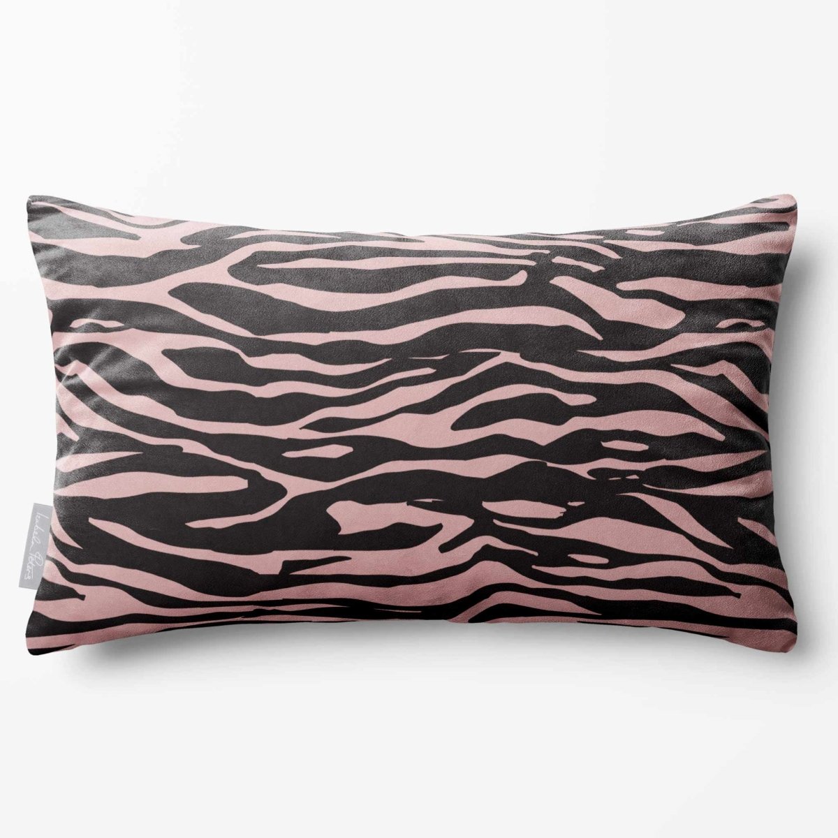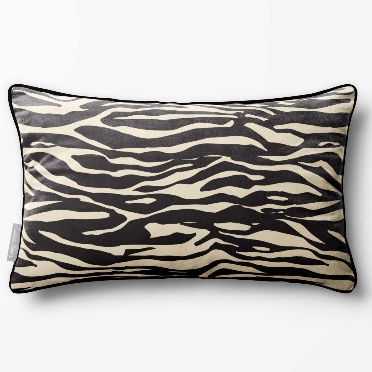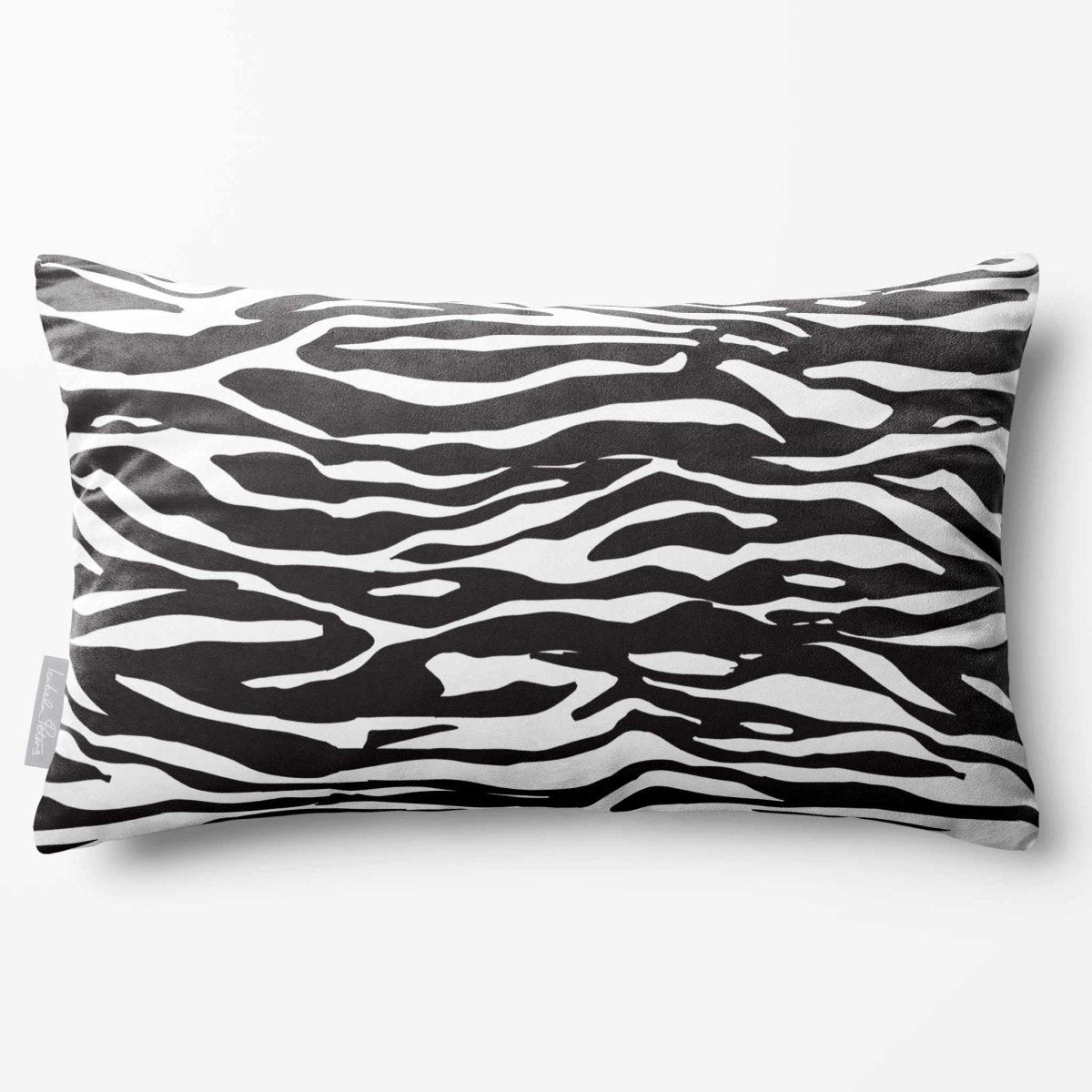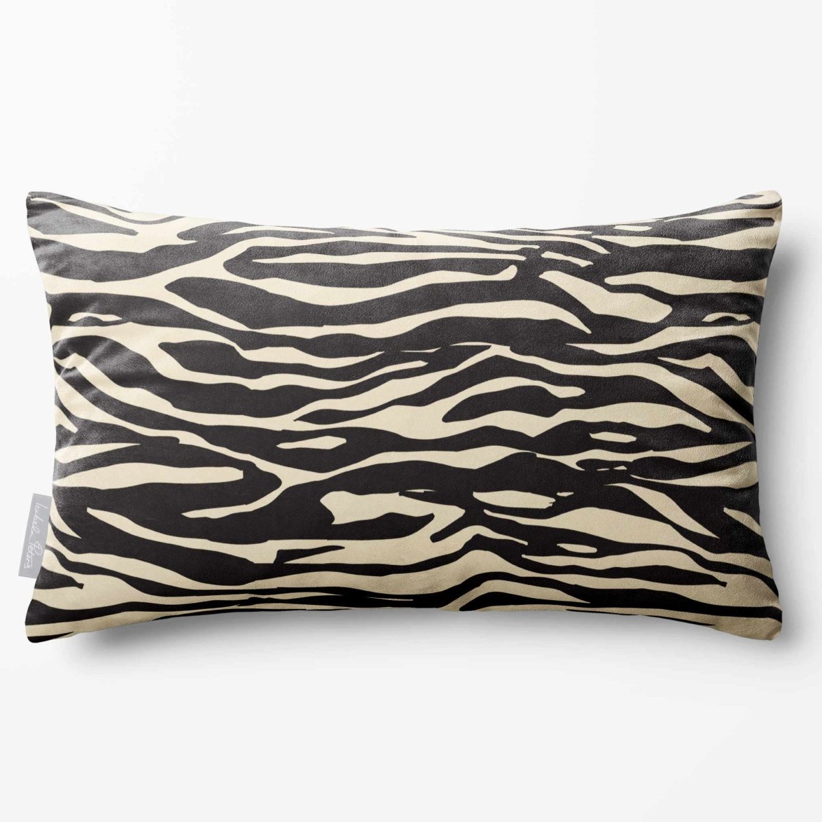 The Zebra Print rectangle cushion features a bold motif that stretches across a longer frame for a sleek, contemporary accent. The velvet base adds softness and depth to the dynamic design.