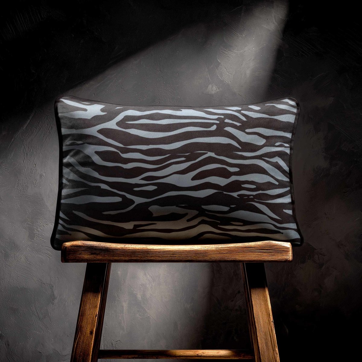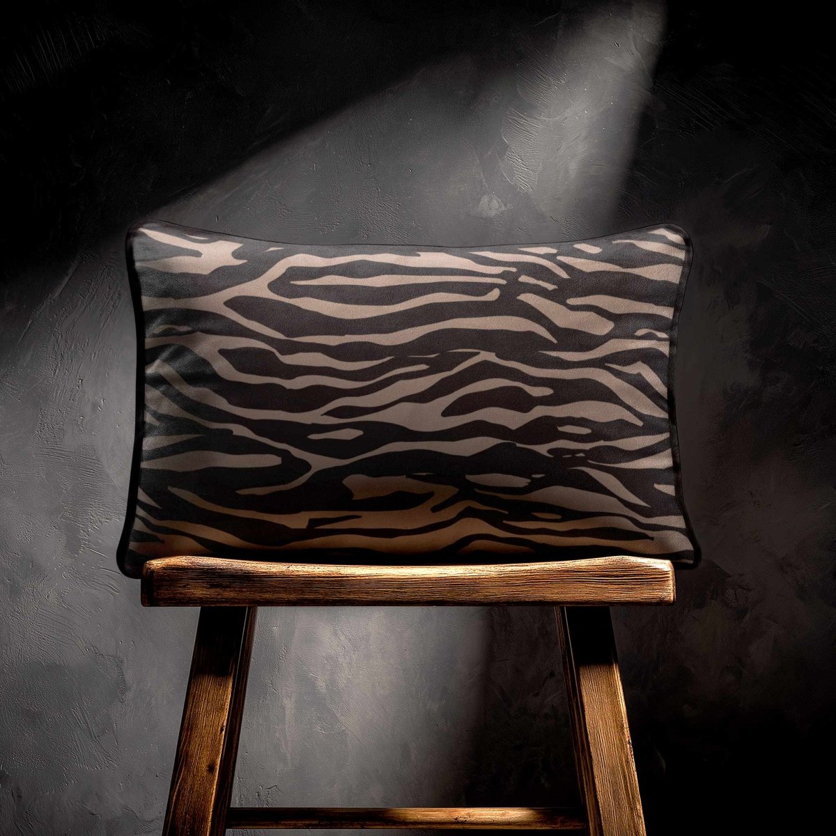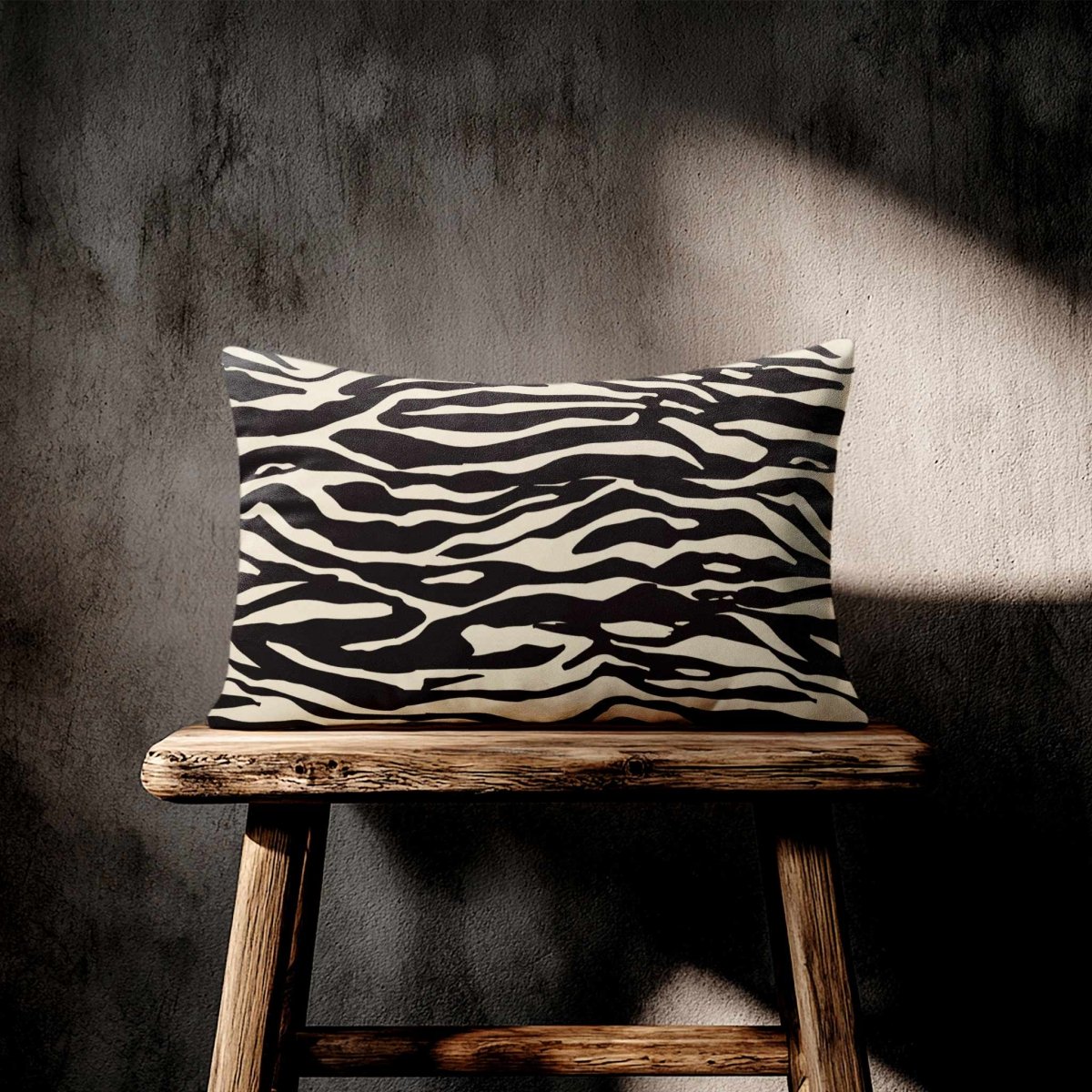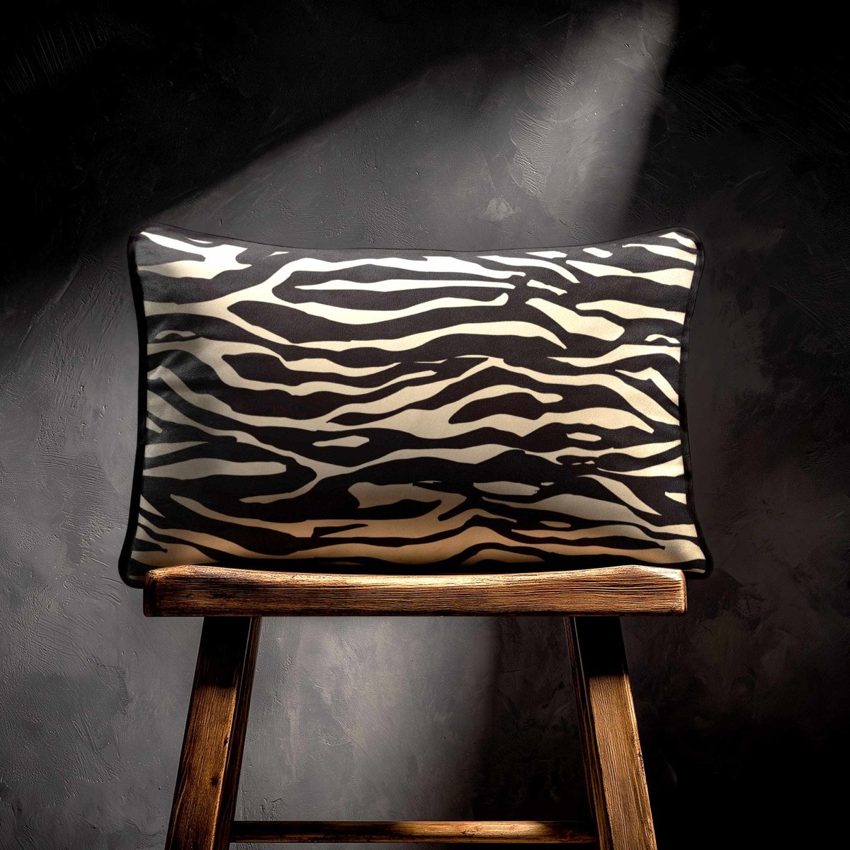 The Zebra Print rectangle cushion features a bold motif that stretches across a longer frame for a sleek, contemporary accent. The velvet base adds softness and depth to the dynamic design.